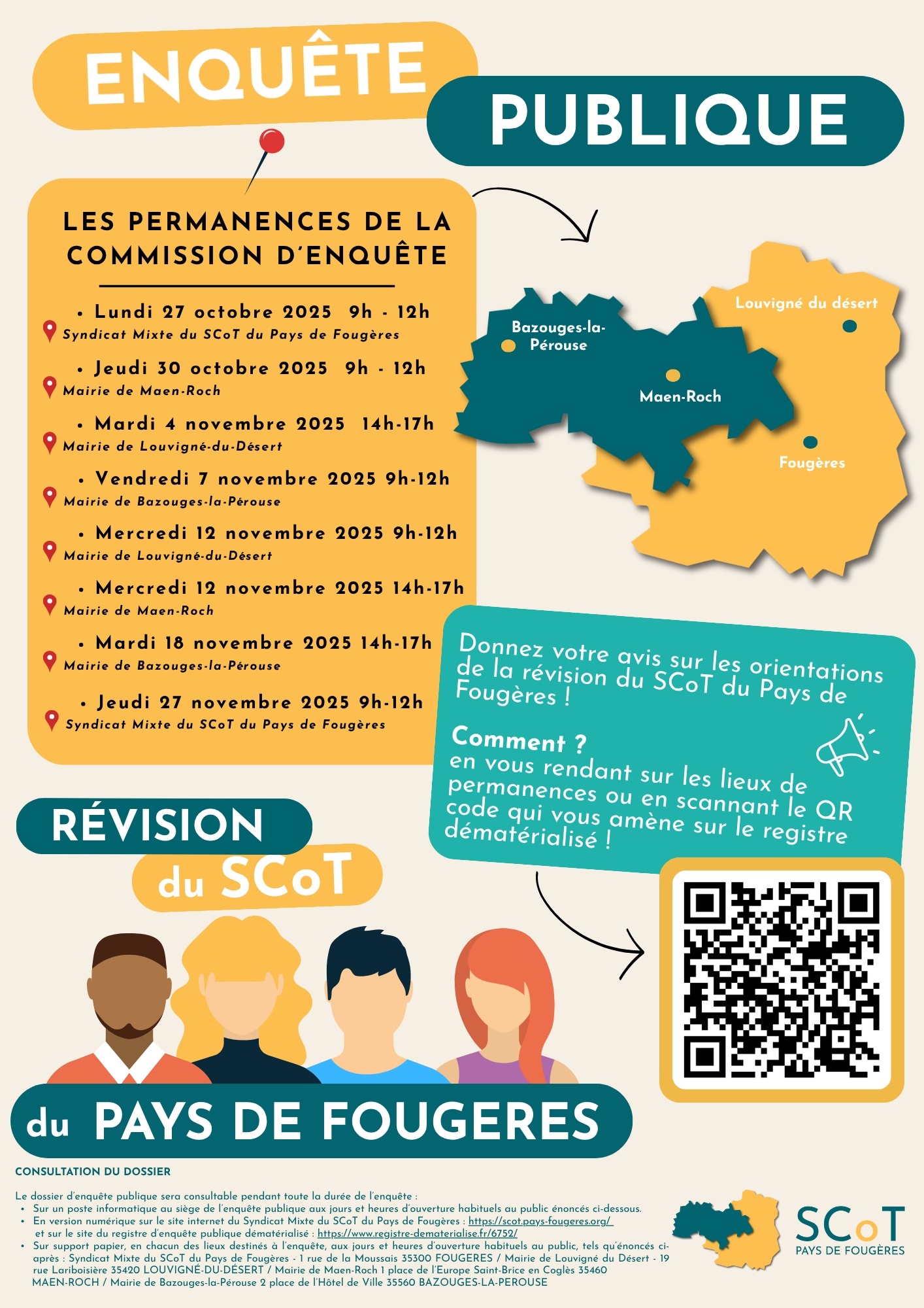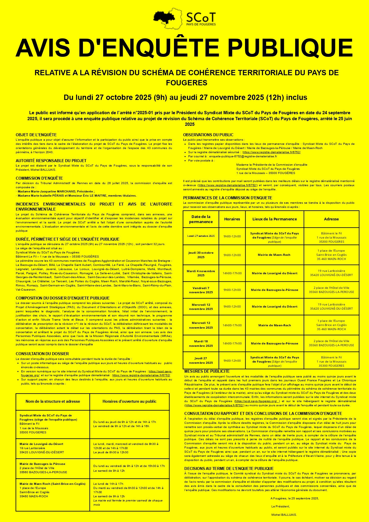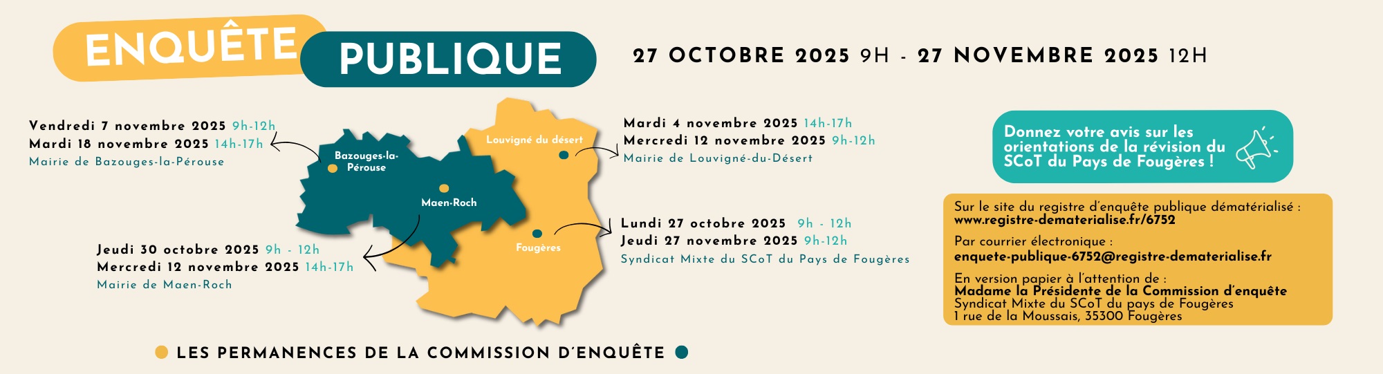 Le Syndicat Mixte du SCoT du Pays de Fougères organise une enquête publique sur le projet révisé du Schéma de Cohérence Territoriale (SCoT), arrêté le 25 juin 2025.