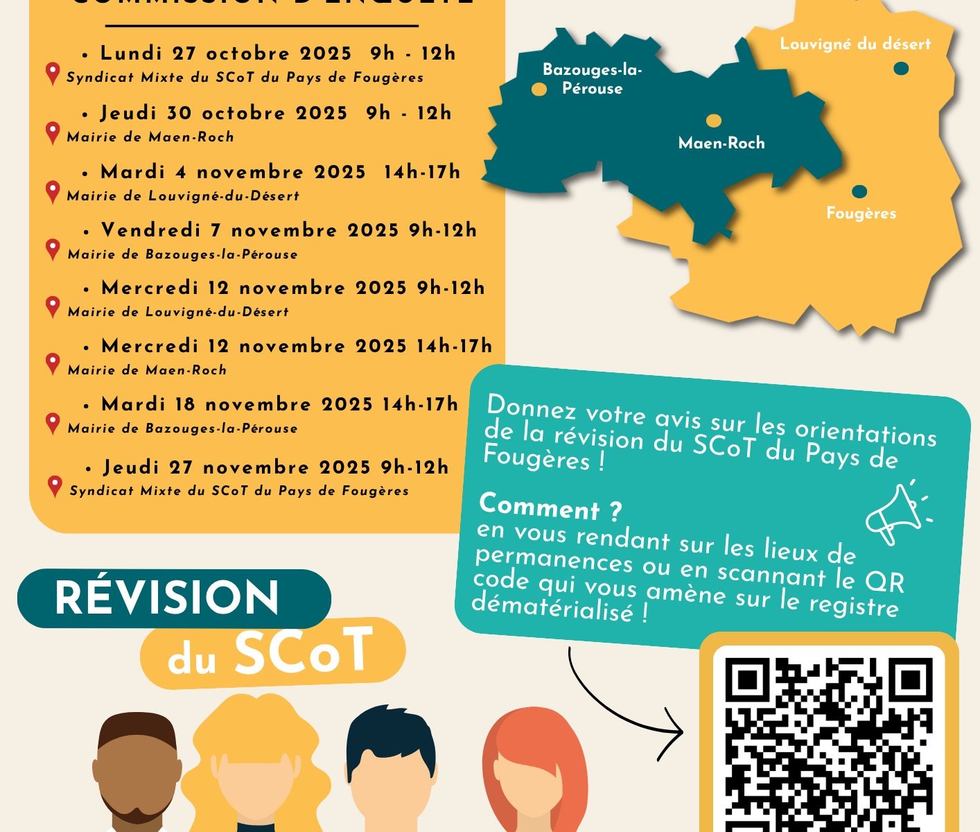 Le Syndicat Mixte du SCoT du Pays de Fougères organise une enquête publique sur le projet révisé du Schéma de Cohérence Territoriale (SCoT), arrêté le 25 juin 2025.