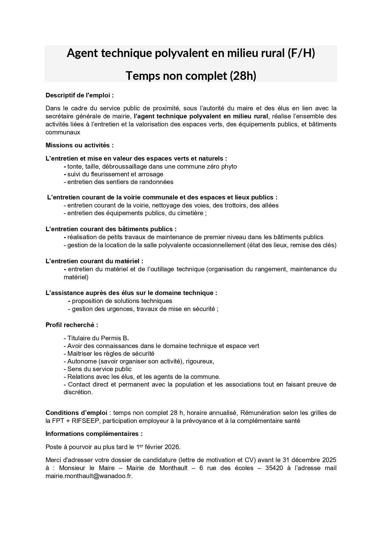 Envoyer CV et lettre de motivation à M le Maire de Monthault, 6 rue des écoles 35420 MONTHAULT ou par mail mairie.monthault@wanadoo.fr. Renseignements au 02.99.98.03.47